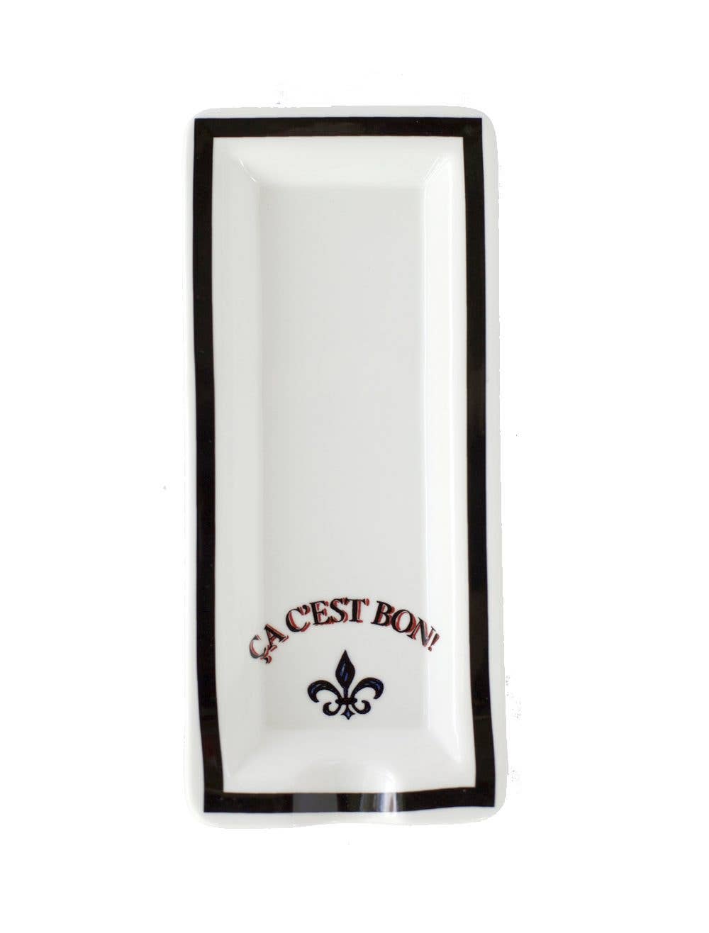 This ceramic spoon rest features our “Ca C’est Bon” design in black and red, along with a black fleur de lis printed on white.