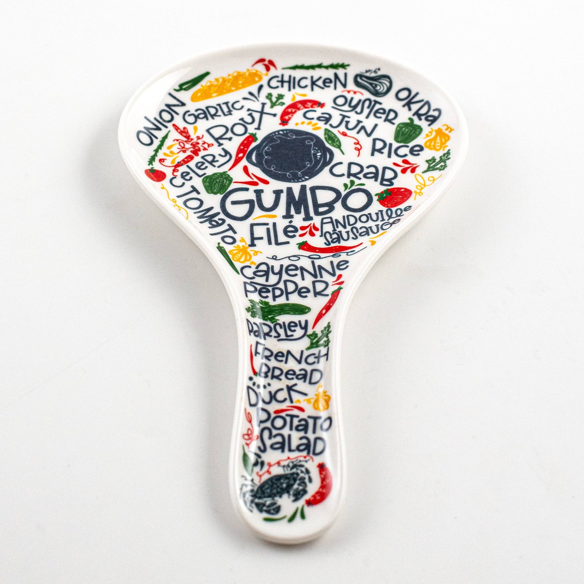 This ceramic spoon rest features our new “Gumbo” design. Artwork includes images and words associated with the famous Louisiana dish.
